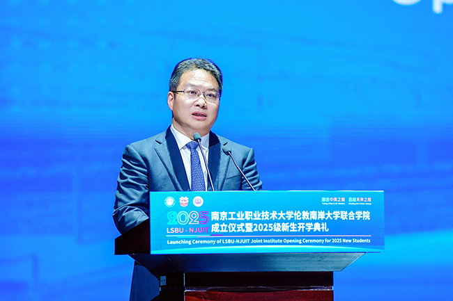 孟韬代表兄弟院校,热烈祝贺南京工业职业技术大学与英国伦敦南岸大学联合学院正式成立。他强调,在人工智能与产业变革加速演进的时代背景下,职业教育学生应以开放的胸怀和创新的思维迎接挑战,提升跨文化沟通与创新思辨能力,成长为兼具专业素养与国际视野的高素质人才。