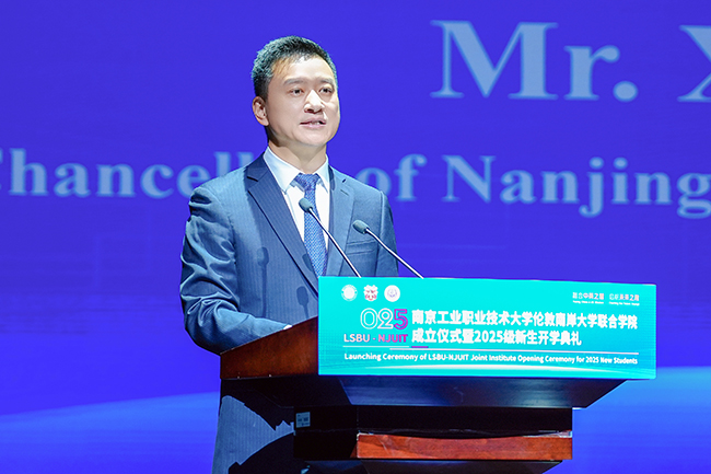 谢永华在致辞中表示,作为职教本科探索者,学校秉持开放办学理念,此次携手在应用型教育、产学研及工程技术领域享誉的伦敦南岸大学共建联合学院,既是响应国家号召的战略选择,也是学校国际化办学进程中的重要里程碑。学校作为全国首批本科层次职业教育试点院校,始终秉持开放、创新、合作的理念,先后创办中赞职业技术学院南工机电学院、全国首家职业教育孔子学院、“中文+职业技能”国际推广基地及柬华应用科技大学,吸引来自53个国家的留学生,形成多元开放格局。他指出,与伦敦南岸大学的合作,是理念契合、优势互补的成果,双方将汇聚优质教育资源,打造中外合作办学典范。谢永华要求首届新生,要胸怀理想、脚踏实地,扎根中华文化、拥抱世界文明,在中英文化交融的沃土上成长为兼具专业素养与国际视野的时代新人。