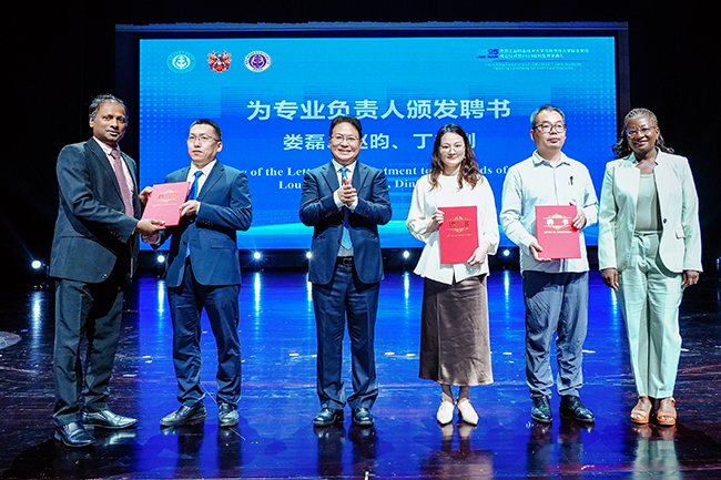 在全场嘉宾与师生的共同见证下,南京工业职业技术大学伦敦南岸大学联合学院正式揭牌。中英双方代表共同为学院揭牌,标志着两校合作翻开了崭新篇章。学校领导为专业负责人颁发聘书,并为首届新生代表佩戴校徽。