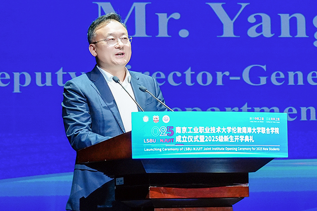 杨树兵向伦敦南岸学院的成立表示热烈祝贺和美好期待。他指出,南京工业职业技术大学是全国首家公办职业本科院校,伦敦南岸学院作为学校的第一个中外合作办学机构,也是中国职教本科的第一个中外合作办学机构,具有标志性意义。他表示,多年来,南工在国际合作交流方面始终走在全省前列,伦敦南岸学院的成立不仅是南工办学历史上的里程碑,更是全省教育对外开放迈出的一道坚实步伐,省教育厅愿意为学校的外事工作给予更多支持,希望南工充分依托两校的优势学科和优质资源,在课程体系、教学模式、评价标准方面,勇于创新、大胆探索,实现“ 1+ 1 ”大于“2” 的效果,打造独具特色的国际化卓越工程人才的培养体系,让学院成为彰显南工办学实力的靓丽名片。对于新入学的新生,他表达三点期许:一是要尽情拥抱独特的多元文化环境,既要深爱博大精深的中华文化,也要以开放的心态欣赏世界的丰富多彩;二是要牢牢把握宝贵的优质教育资源,珍惜良好学习环境,努力将知识转化为能力,练就过硬本领;三是要牢记身上肩负的社会责任,让个人理想与国家命运紧密相连,努力成长为有骨气、有底气、有锐气的时代新人。