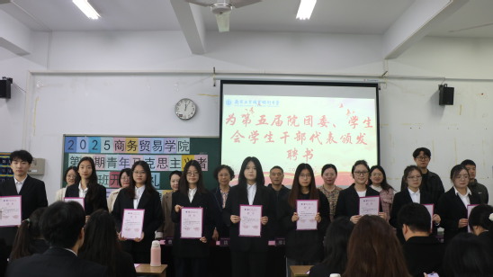 大会在庄严的国歌声中拉开了序幕。王静宣读了《关于商务贸易学院第六届团委、学生会学生干部任职的决定》。新一届团学骨干接过沉甸甸的接力棒,肩负起服务同学、推动发展的使命,标志着学院团学工作迈向新的征程。学院领导与老师为第五届团委学生会的优秀学生干部代表颁发聘书。一纸聘书,承载的是一年来的辛勤耕耘与无悔奉献;一张合影,定格的是青春奋斗的闪光印记。他们以责任书写担当,以实干诠释初心,为学院团学工作注入了蓬勃活力。