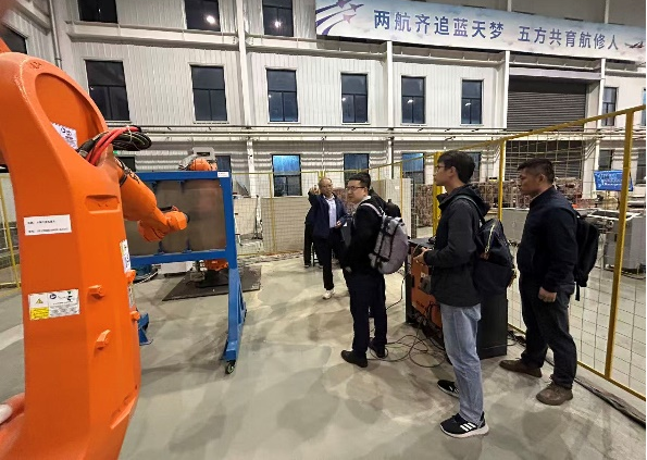10月24日上午,徐滕州带队抵达西安航空职业技术学院飞机维修工程中心,在中心负责人的热情引导下,依次参观了多个实训区域。在螺栓自动化拧紧项目展示区,航空维修工程学院张院长表示该项目依托校企深度合作,整合了高校的研究优势与企业的实践资源,在技术研发初期便充分考虑产业实际需求,确保研究成果能快速转化应用。张院长还重点介绍了自动化钻铆系统的技术优势,相比传统人工钻铆,效率提高数倍,且有效降低了人为误差导致的产品质量问题。随后,调研团队来到飞机自动化对接实训室,驻场工程师详细介绍了系统的运行流程及在主机厂的应用情况。调研团队老师就该系统的稳定性、维护成本及与其他设备的兼容性等问题与工程师展开深入交流。下午,调研团队参观了航空发动机维修中心。中心负责人详细介绍了该校航空发动机维修实训课程建设、人才培养及学生就业等方面的思路和经验。调研团队成员表示,西安航院在航空发动机维修领域的人才培养经验具有很强的借鉴意义,可为我院相关专业的发展提供参考。