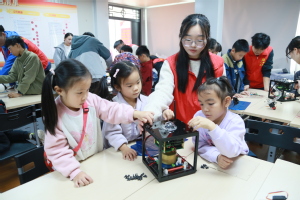 志愿者同学为社区青少年准备了一堂“知识科普+手工制作”的趣味科学课。从中国古人的“问天”梦出发,到问鼎苍穹的中国空间站,生动地叙述了我国的航天发展历程。随后还介绍了我国先进火箭、卫星、空间站等航天科技成果。在手工制作环节,社区小朋友组成四个小组,齐心协力组装卫星教具,在动手操作中了解人造卫星的构造和功能,并通过木质小模型的制作,拥有了属于自己的小小卫星。