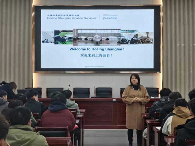 会上,上海波音人力资源部总监张丽系统介绍了公司的发展历程、业务范围与企业文化,并特别展示了2025届已入职校友致学弟学妹的一封信,以鲜活事例增强了企业的亲和力与感召力。她就同学们关心的职业发展路径与岗位能力要求进行了精准解读。随后,生产部门负责人详细阐述了运营部的组织架构、核心功能、授权资质及维修能力,为学生勾勒出清晰的业务图谱和发展平台。