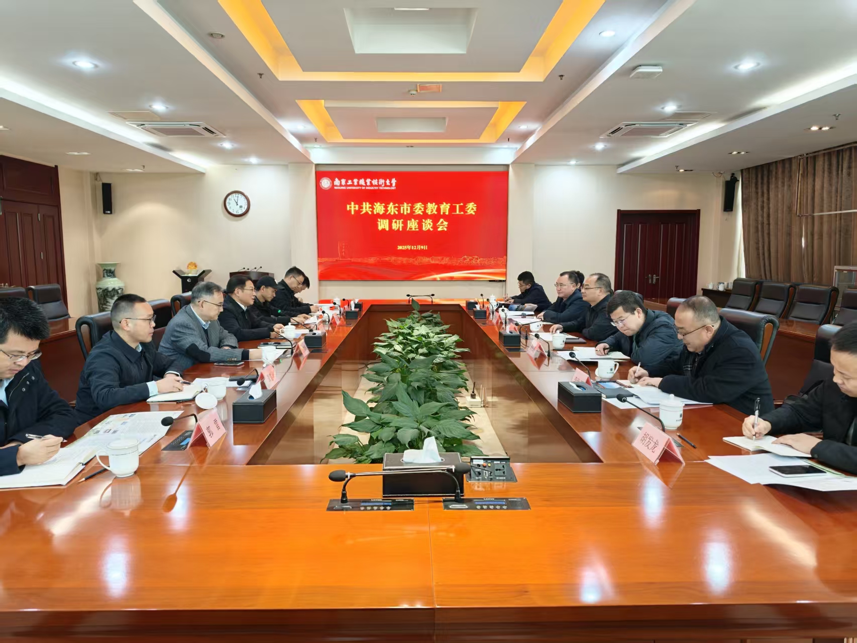 12月9日上午,海东市委副书记、教育工委书记王述友一行来校调研,我校党委副书记、校长何学军,党委常委、纪委书记邱正祥,党委常委、副校长潘旭海在行政楼辅楼一楼会议室接待来宾,座谈会由潘旭海主持,学校相关部门负责同志参加座谈。