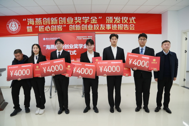 12月17日下午,2025年“海燕创新创业奖学金”颁发仪式暨“匠心创客”创新创业校友事迹报告会在我校双创大楼C栋214教室成功举办。校党委常委、副校长高宏彦,海燕奖学金捐赠人、我校优秀校友、扬州海燕餐饮管理有限公司创始人吴志广出席了此次活动。发展规划处(校友会秘书处、教育发展基金会秘书处)、学工处、招生就业处、团委等部门负责人,以及各二级学院相关负责人和80余名师生代表共同参与。活动由创新创业教育工作领导小组办公室副主任、创新创业学院直属党支部副书记、创新创业学院副院长黄继平主持。
