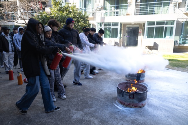 随着急促的消防警报声响起,实战演练正式拉开帷幕。在吴波的专业指导下,同学们迅速分组、沉着应对,按照所学要领规范操作灭火器,精准扑灭火源。整个演练过程衔接紧密、行动一致,充分检验了校园消防应急预案的可行性,也切实锤炼了学生的应急处置能力。