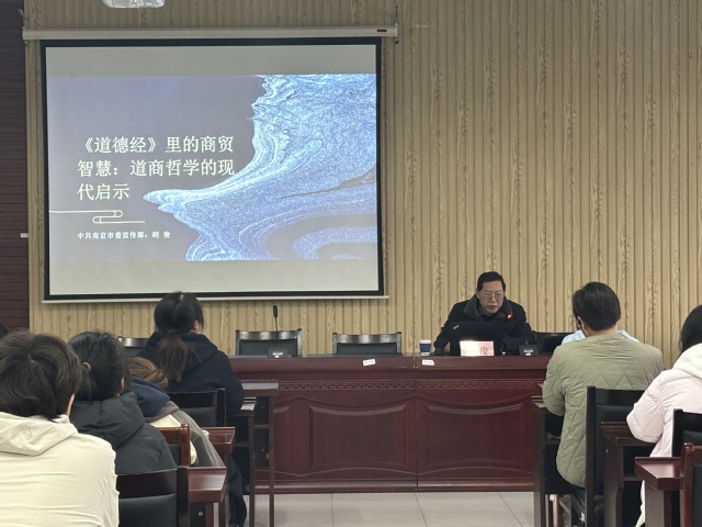 3月11日下午,商务贸易学院邀请南京市委宣传部机关党委二级调研员、知名《道德经》研究专家胡俊作《道德经里的商贸智慧:道商哲学的现代启示》专题讲座。