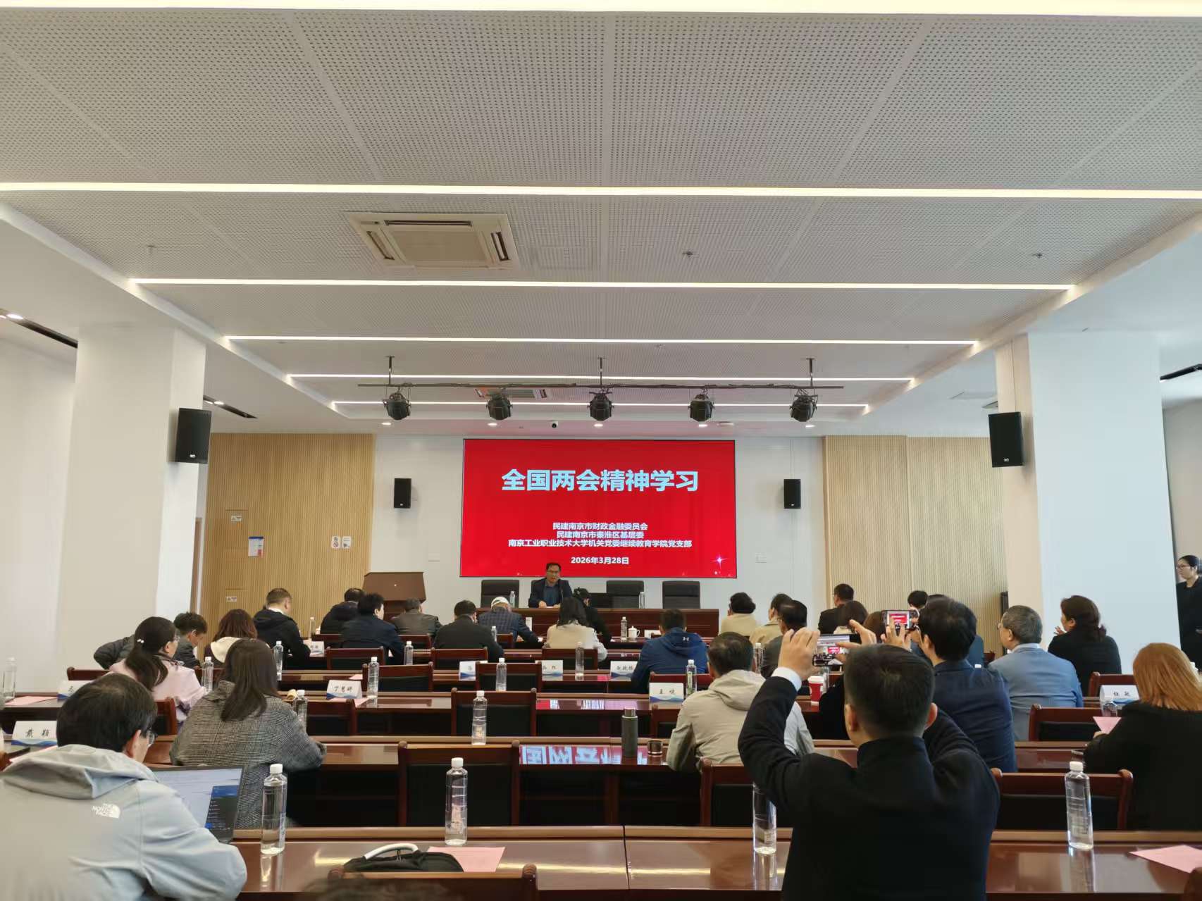 3月28日上午,由民建南京市财政金融委员会、民建南京市秦淮区基层委、我校大学科技园联合举办的“深学细悟两会精神 践行民建初心担当”主题活动在我校大学科技园E栋416会议室成功举办。民建市委会副主委吴先斌,民建市委会参政议政处处长潘小苏,民建南京市财金委主任、秦淮区基层委主委、秦淮区人大副主任刘明来,南京白下高新技术产业开发区管委会科技人才处处长沈赟华,民建南京市财金委副主任、秦淮区基层委副主委、科技园管理有限公司董事长、总经理施成以及50多位民建会员、园区企业代表等参加本次活动。
