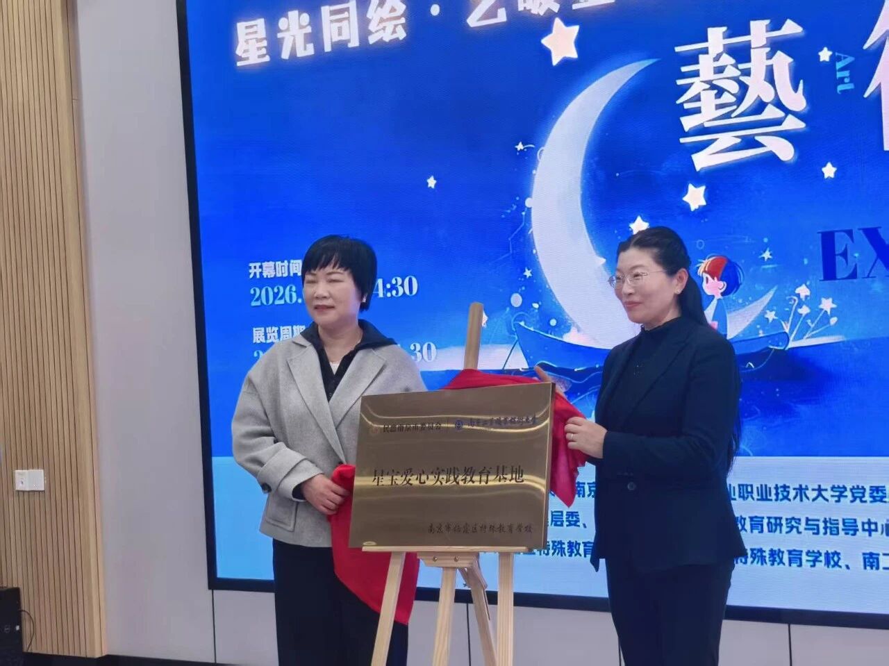 开幕式上,“星宝”代表分享创作感受并向嘉宾赠送作品。民盟栖霞区基层委员会和梅桂兰女士分别向服务队进行了爱心捐赠。汤一梅与张莉共同为“星宝爱心实践教育基地”揭牌,这标志着我校与栖霞区在特教领域的合作迈向新阶段。