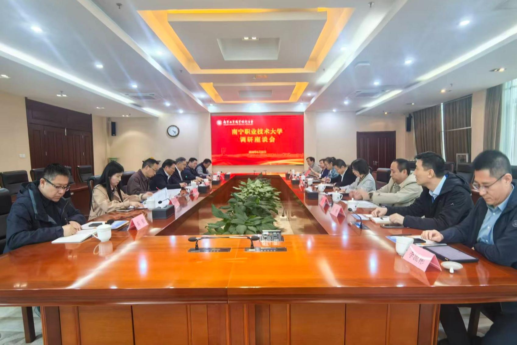 4月23日下午,南宁职业技术大学党委副书记、校长宾月景一行来校调研。我校党委副书记、校长何学军,党委常委、副校长潘旭海在行政楼辅楼一楼会议室接待来宾,相关职能部门负责同志参加座谈。