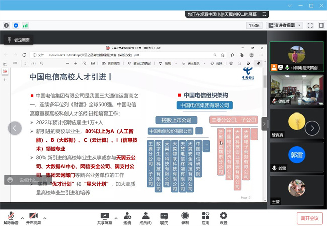 为了贯彻落实国家发展和改革委员会、教育部、工业和信息化部、人力资源和社会保障部、农业农村部、国务院国有资产监督管理委员会、中国共产主义青年团中央委员会、中华全国妇女联合会等部门联合印发的《关于深入实施创业带动就业示范行动力促高校毕业生创业就业的通知》(发改办高技〔2022〕187号)文件精神,做实双创示范基地结对共建,3月16日上午,南京工业职业技术大学与中国电信集团有限公司开展线上交流会。中国电信集团有限公司天翼创投对外孵化运营总监邵杰,我校计算机与软件学院副院长郭雷,创新创业教育工作领导小组办公室副主任、创新创业学院副院长黄继平,计算机与软件学院部分教师代表参加了线上交流会。