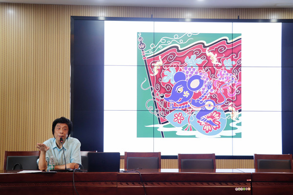 十二生肖云锦图将现场气氛推向了高潮。“鼠图上的纹样,头上是石榴代表多子多福,脚下踩的葫芦意为福禄双至;牛图上的纹样是希望大家牛气冲天,力转乾坤;虎图上的纹样是祝福大家虎虎生风,大富大贵;兔图上的纹样有突飞猛进、一展宏图之意;龙图上的纹样有蛟龙出海,一飞冲天之意;蛇图上的纹样有腾蛇乘雾,八面玲珑之意……”金文一一向同学们细致讲解。他指出,在几千年的历史传承与发展过程中,云锦工艺要传承和发扬光大,必须根植于传统文化,在此基础上贴近生活,不断创新。