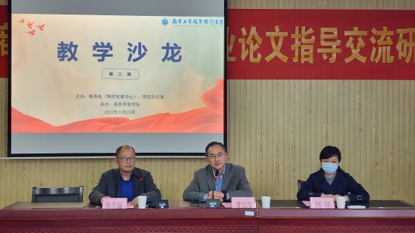 11月23日下午,由教务处(教师发展中心)主办、商务贸易学院承办的南京工业职业技术大学第二期教学沙龙活动——“职业本科毕业设计(论文)指导交流研讨”在求真楼404举行。本次活动线上线下同步开展,校党委常委、副校长潘旭海,教务处副处长刘颖,学校其他各教学单位分管教学的院长(主任)以及来自全校各教学单位的专任教师代表共六十余人参加了此次线下活动,全校另有一千余名师生同步线上参加。活动由商务贸易学院副院长朱玉赢主持。