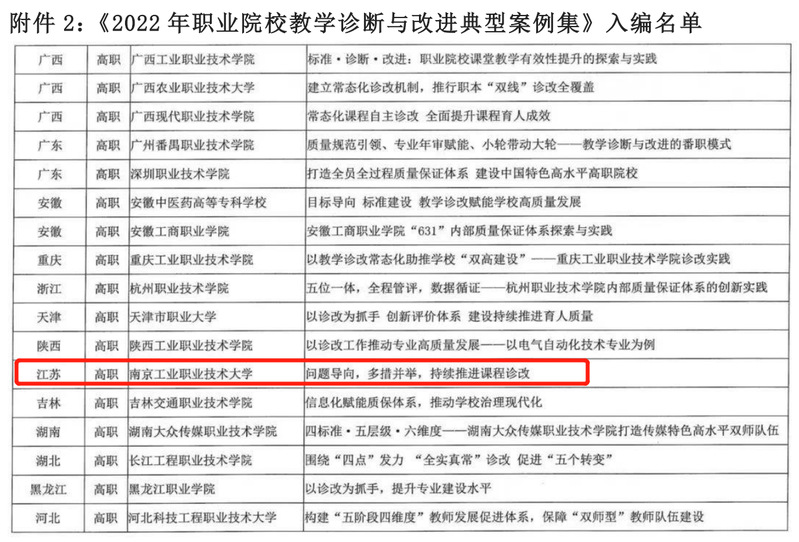 近日,中国教育科学研究院、职业教育与继续教育研究所发布了《关于展示2022年职业院校教学诊断与改进典型案例的通知》,我校提交的双创课程诊改案例---《问题导向,多措并举,持续推进课程诊改》入编《2022年职业院校教学诊断与改进典型案例集》。