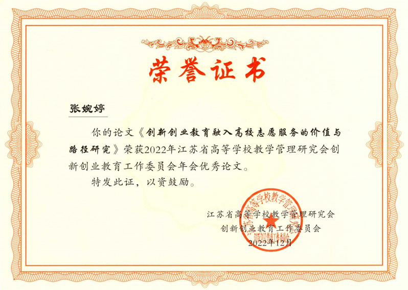 近日,江苏省高等学校教学管理研究会创新创业教育工作委员会2022年年会论文评选结果公布,我校计算机与软件学院张婉婷老师撰写的《创新创业教育融入高校志愿服务的价值与路径研究》论文被评为优秀论文。据悉,本次论文征集共收到省内39所学校110篇论文投稿,经专家审核后,共评选出40篇优秀论文。