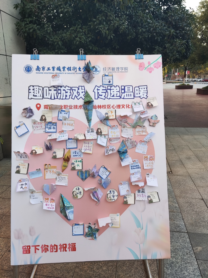 活动中,爱心形状的展示板上记录了参与活动的同学对自己和大家的祝福,数不清的折纸也正诉说着自己未来的“梦想”,一张张幸福的笑脸上洋溢着大学生独有的幸福与洒脱。