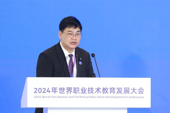 吴岩代表中国教育部向远道而来的各位中外嘉宾表示欢迎。他指出,建设教育强国,高等教育是龙头,基础教育是基点,职业教育上连高等教育,下接基础教育,是教育体系的腰,只有把这个腰锻造为铜腰,教育强国才能真正建立起来。职业教育肩负着培养更多高技能人才的光荣使命,尤为重要,尤为必要。他指出,职业教育和产教融合有三个必由之路。第一,产教融合是职业教育的必由之路,职业教育的发展需要职业院校和企业双向发力,相互成就,共生共长,实现你中有我,我中有你,由物理反应转变为化学反应。中国正在积极探索具有中国特色的产教融合模式,统筹推进一体两翼体系建设工作。第二,合作办学、合作育人、合作就业、合作发展等四个合作是产教融合的必由之路,实现产业、专业、就业三联动,让职业院校培养的学生企业用得上、离不开、信得过,让院校培养的人才真正受企业和用人单位欢迎。第三,五金建设是四个合作的必由之路。四个合作是方式,五金建设是内功,专业、教材、课程、师资、实践是直接关系职业教育、人才培养质量的关键要素。要推动专业动态调整,科学设计课程内容,优化升级教材形式,细分教师岗位能力,研究制定实习实训标准,建设产教融合实训基地,以教学关键要素的小切口,推动职业教育的大改革。他表示,中国愿分享职教经验,加强与各国职业教育交流,互学互鉴,共建共享,协同推动职业教育高质量发展。