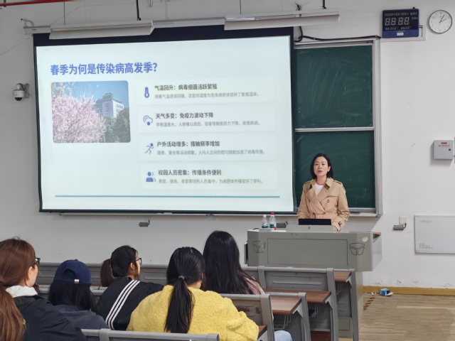 讲座中,芮琴结合春季气温波动大、病毒易活跃的特点,围绕流感、诺如病毒等春季高发传染病,系统讲解了其常见特点与主要传播途径。她通过生动的案例和通俗的语言,深入分析了校园内传染病传播的风险环节,并重点强调了疫苗接种在预防流感中的关键作用。同时,她详细阐述了勤洗手、常通风、注意饮食卫生等日常防护要点,倡导同学们通过规律作息、适度锻炼增强体质,多措并举提升自我防护能力。