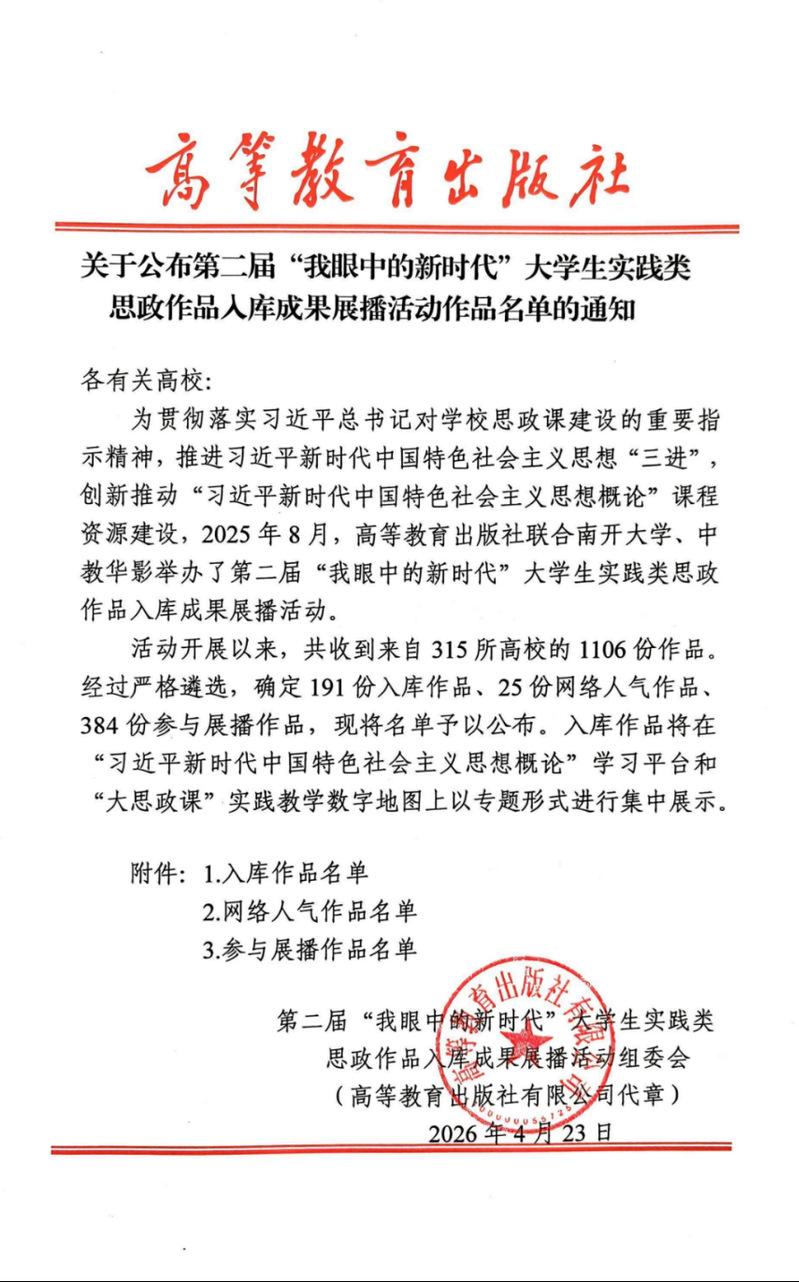 为贯彻落实习近平总书记对学校思政课建设的重要指示精神,推进习近平新时代中国特色社会主义思想“三进”,创新推动“习近平新时代中国特色社会主义思想概论”课程资源建设,2025年8月,高等教育出版社联合南开大学、中教华影举办了第二届“我眼中的新时代”大学生实践类思政作品入库成果展播活动。马克思主义学院邓欣湉老师指导学生创作的《我们的时代我们的答案》作品成功入选全国入库作品;石晓岩老师指导学生创作的《微梦汇星河》作品入选活动参与展播作品。